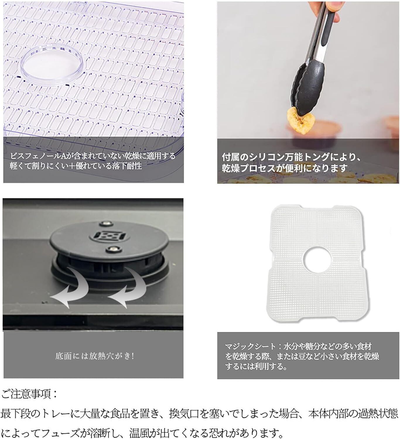 【マジックシート】食品乾燥機にはマジックシートが含まれています水分が多い食品(果物等)を乾燥する際に、水が下に垂れてしまうことを想定し、液体を貯蔵する構造となっています液体が溜まりましたら、捨てて洗えば良いと非常に便利な部品になっています各トレイにマジックシートが必要な場合は、別途購入することができますhttps://www.amazon.co.jp/dp/B093PKMT39